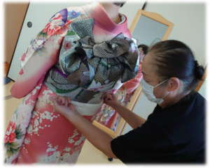 佐賀県からお越しになっている方は、浄瑠璃を通したご縁で、海外に行く機会が多く、しっかりした裾引きを、一人着付けで完成させたいと真剣に学んでいらっしゃいます。