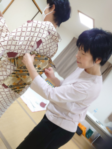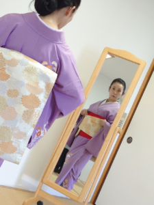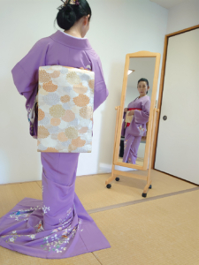 佐賀県からお越しになっている方は、浄瑠璃を通したご縁で、海外に行く機会が多く、しっかりした裾引きを、一人着付けで完成させたいと真剣に学んでいらっしゃいます。