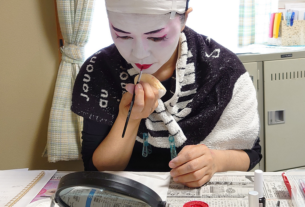 かつらをかぶらない時のドーラン化粧や、かつらをかぶるときの白塗り化粧、男役の化粧など、