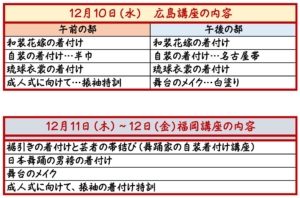 例えば、10日の広島講座では、「和装花嫁の着付け」「琉球衣裳の着付け特別講座」「成人式に向けた振袖実践講座」「舞台メイク➡白塗りのポイント」などです。